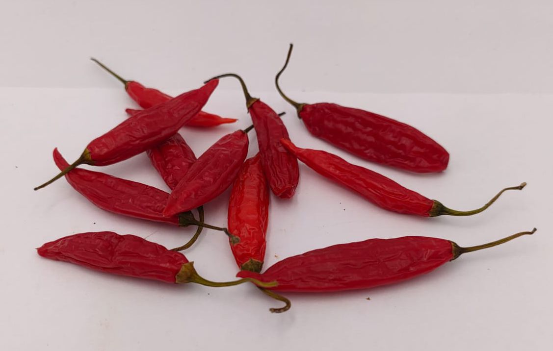 The thin-walled, hanging fruits, which appear like small pendulums on the plants, undergo a colorful ripening from green to bright red. Their length is approx. 4 cm. Particularly noteworthy is their ability to hardly lose any flavour when air-drying. When fresh, they offer a slightly sweet flavour with a pleasant, medium spiciness, making them an ideal ingredient for stews and salsas.